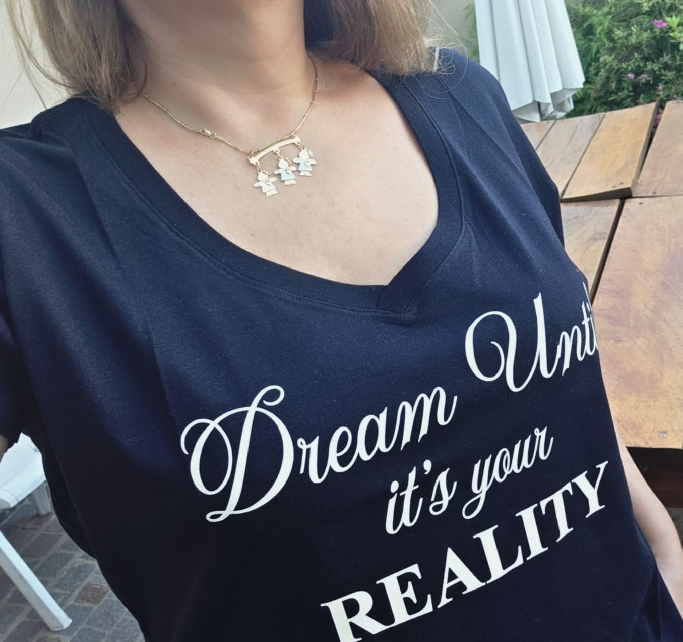 Remera Escote V. Estampa «Dream until it’s your Reality» DTF Algodón Premium. Talle S (Sisa 61cm. Largo 62cm). Talle M (Sisa 63cm. Largo 63cm). Talle L (Sisa 66cm. Largo 64cm).