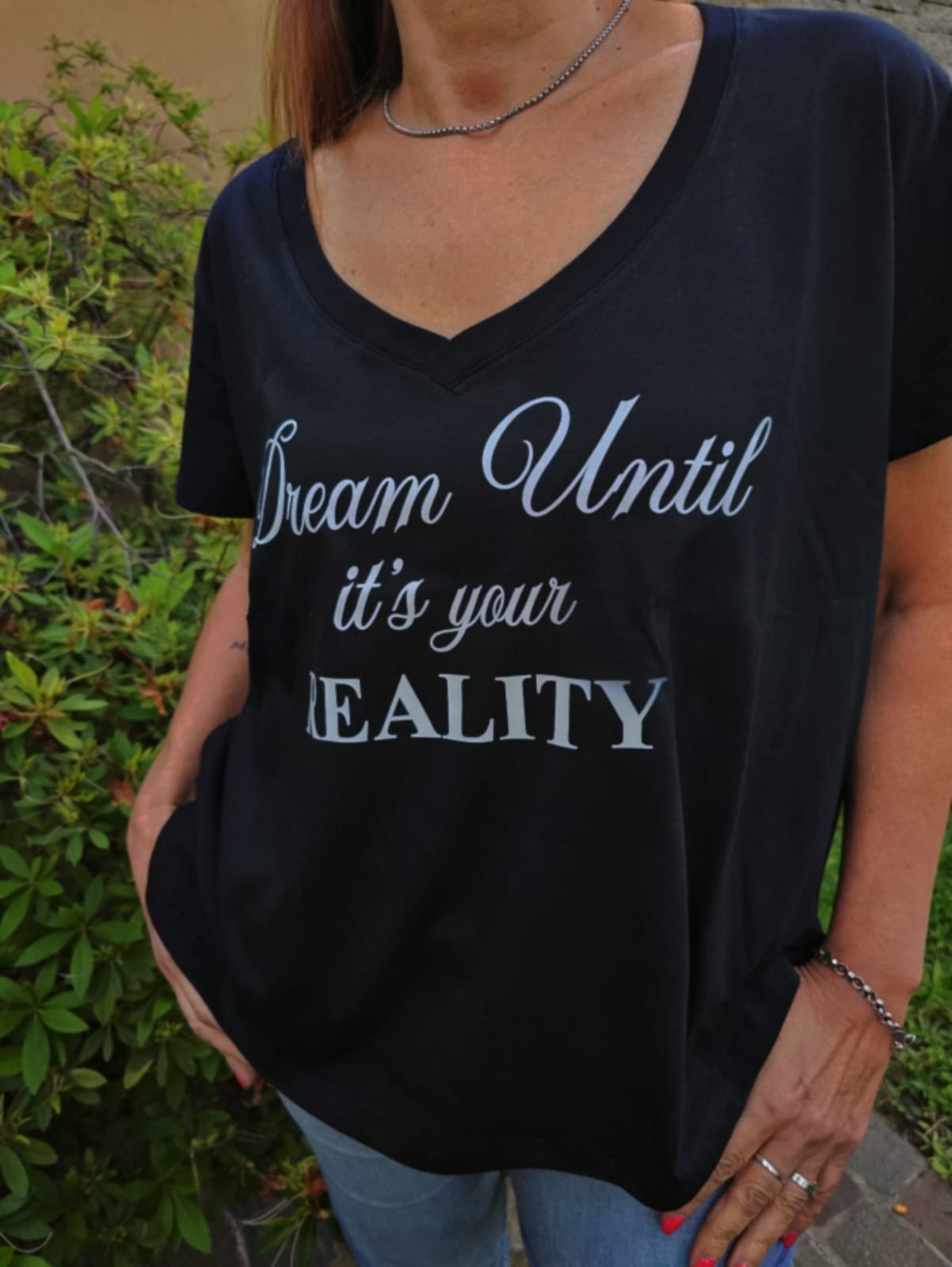 Remera Escote V. Estampa «Dream until it’s your Reality» DTF Algodón Premium. Talle S (Sisa 61cm. Largo 62cm). Talle M (Sisa 63cm. Largo 63cm). Talle L (Sisa 66cm. Largo 64cm).