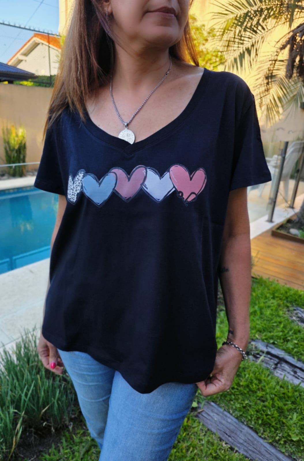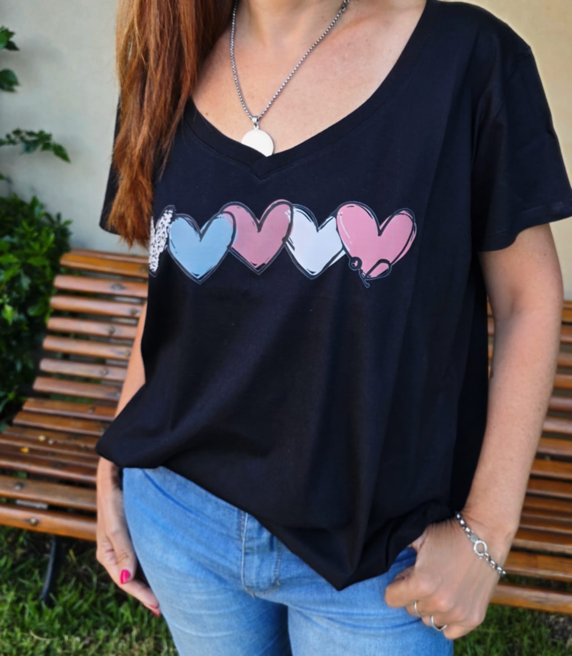 Remera Escote V. Estampa Corazones DTF Algodón Premium.