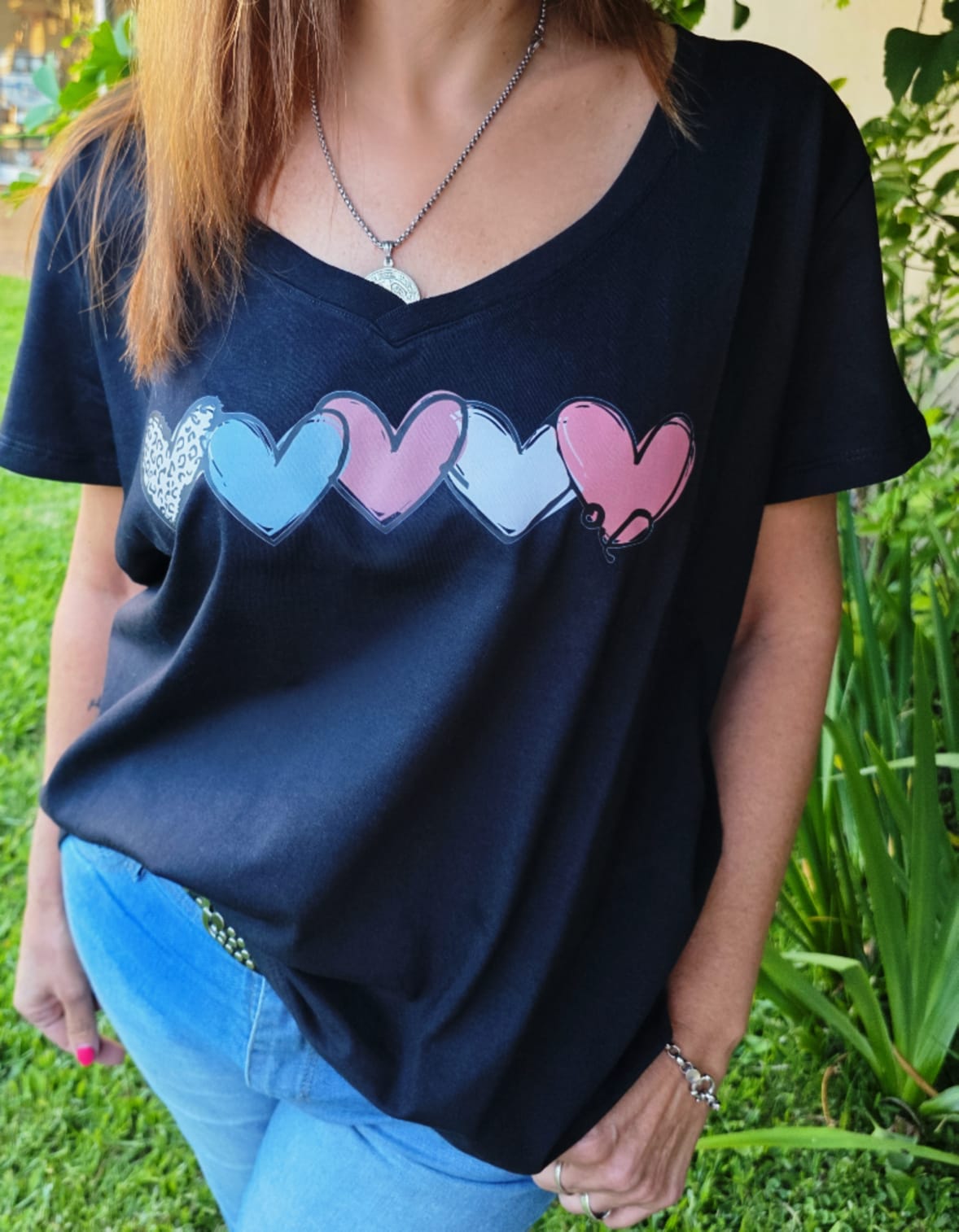 Remera Escote V. Estampa Corazones DTF Algodón Premium. Talle S (Sisa 61cm. Largo 62cm). Talle M (Sisa 63cm. Largo 63cm). Talle L (Sisa 66cm. Largo 64cm).