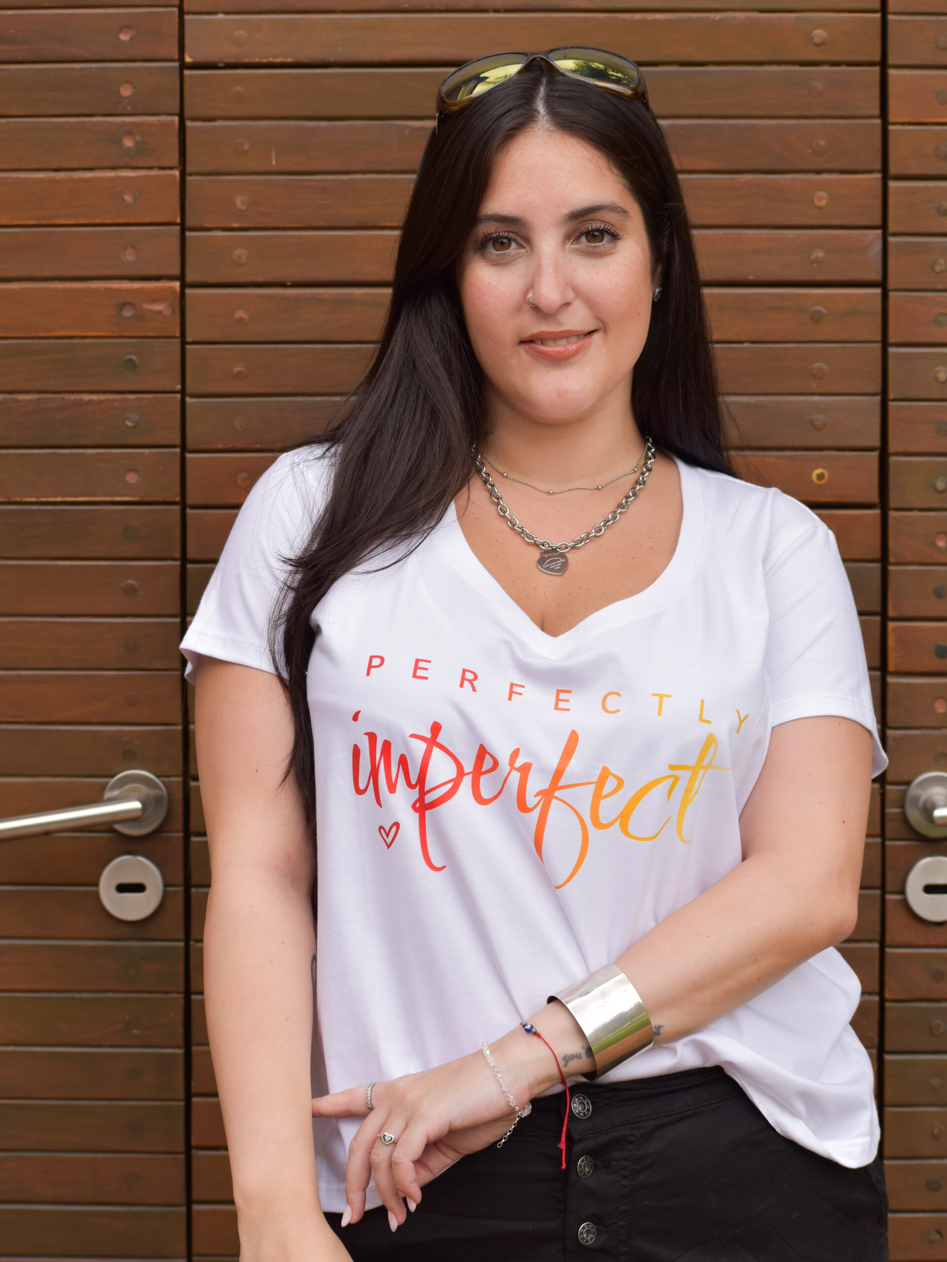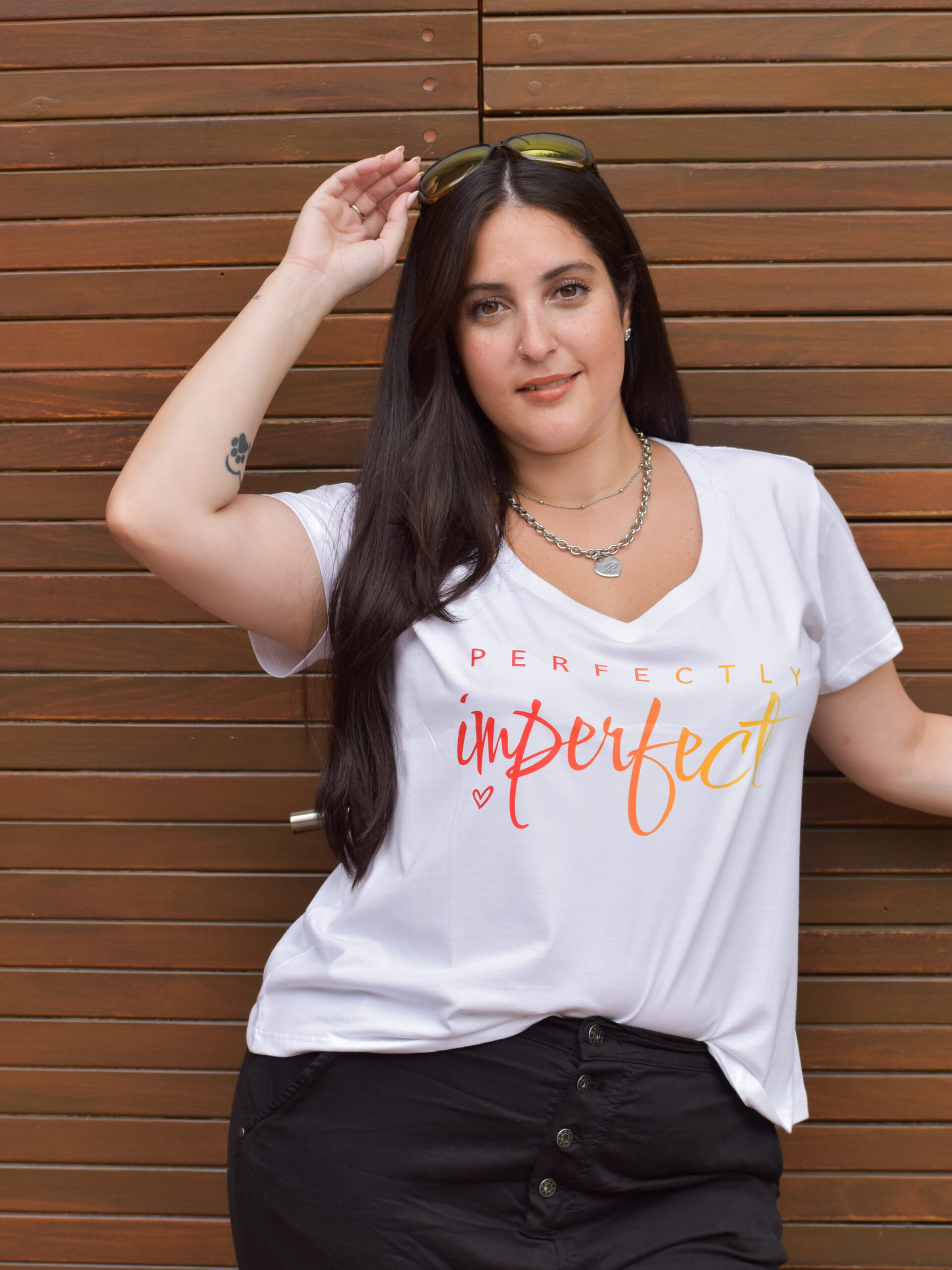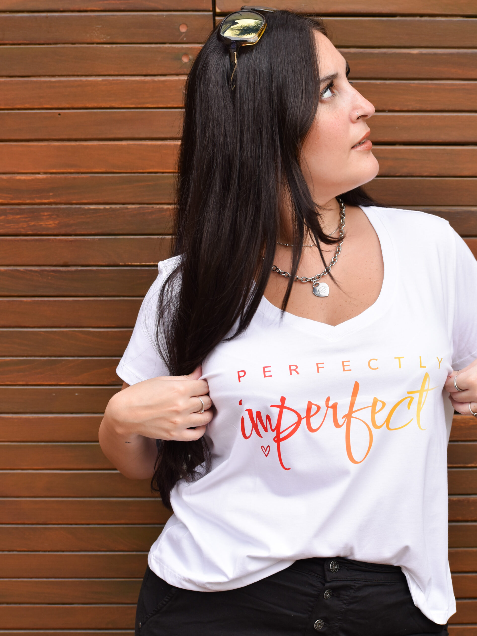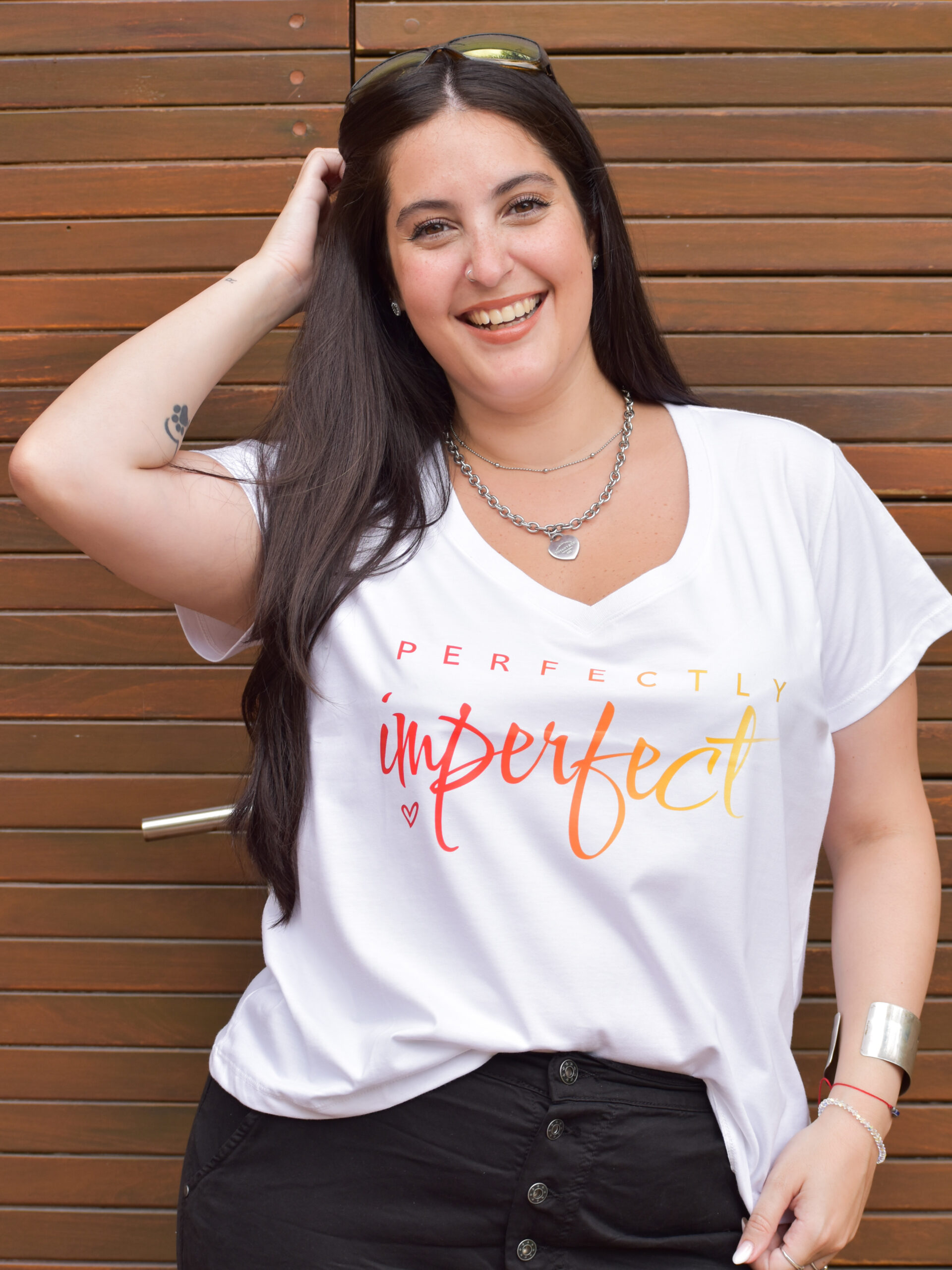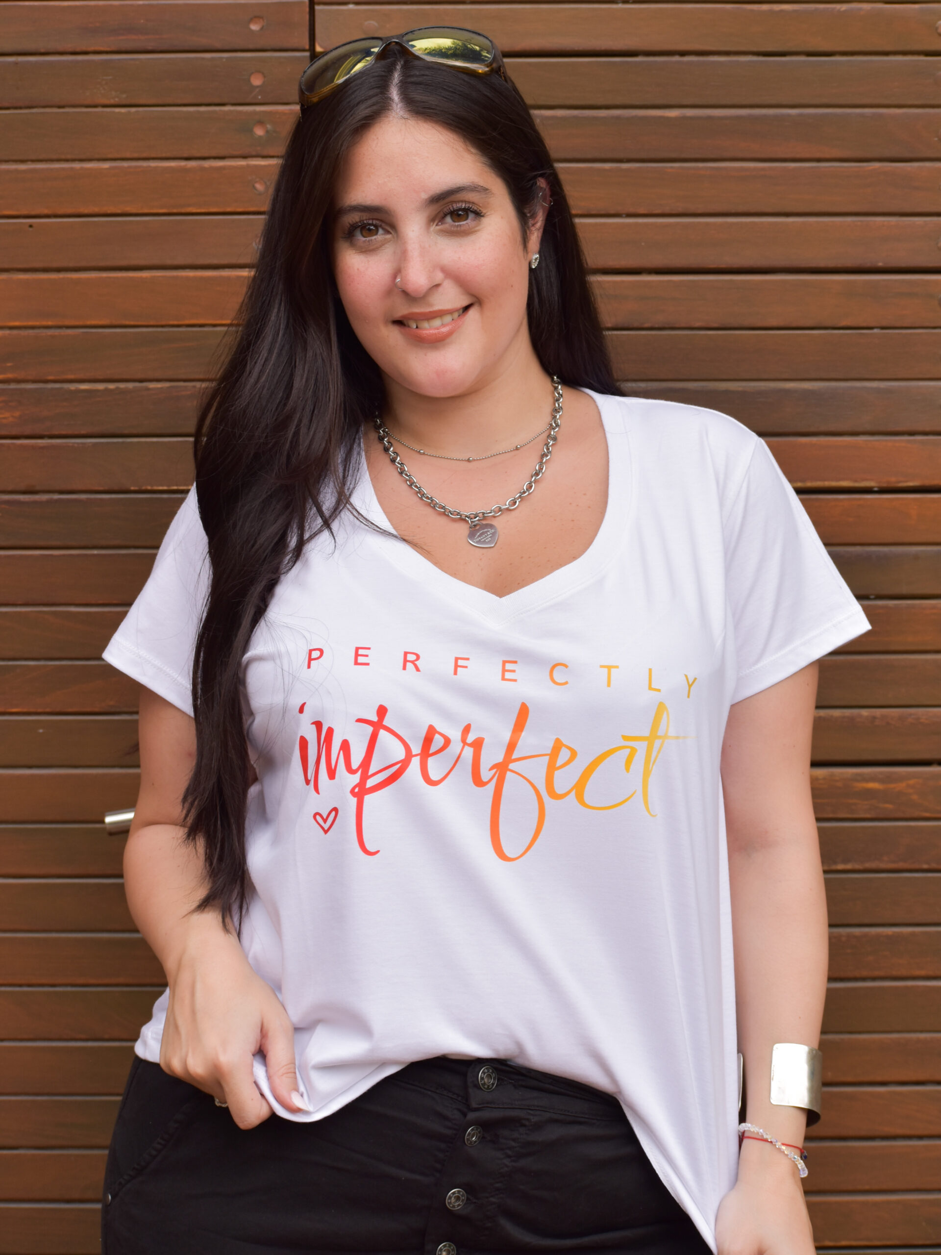 Remera Escote V. Estampa «Perfectly Imperfect» DTF Algodón Premium. Talle S (Sisa 61cm. Largo 62cm). Talle M (Sisa 63cm. Largo 63cm). Talle L (Sisa 66cm. Largo 64cm). Blanco con Letras en Color o Negro con Letras en Plata.
