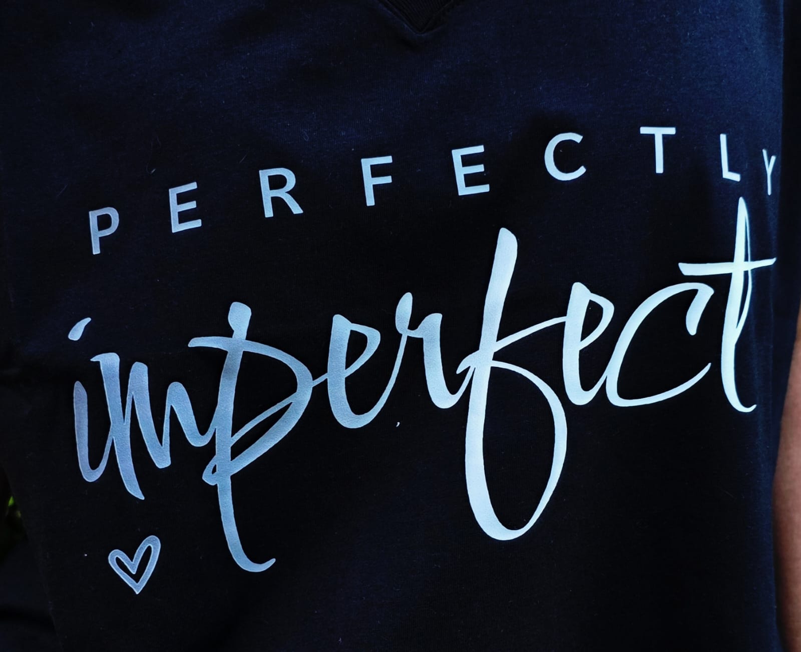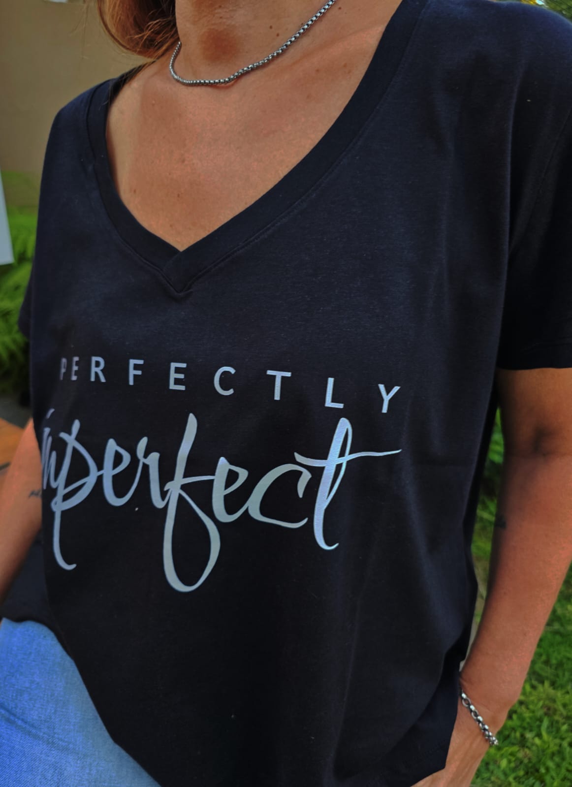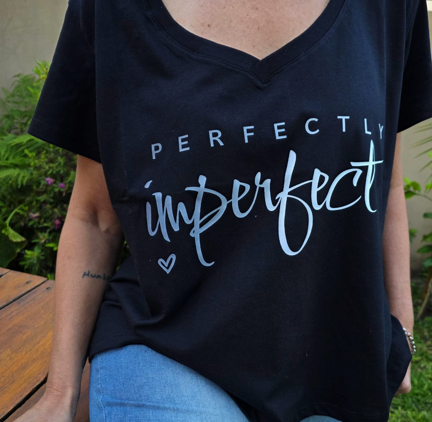 Remera Escote V. Estampa «Perfectly Imperfect» DTF Algodón Premium. Talle S (Sisa 61cm. Largo 62cm). Talle M (Sisa 63cm. Largo 63cm). Talle L (Sisa 66cm. Largo 64cm). Blanco con Letras en Color o Negro con Letras en Plata.